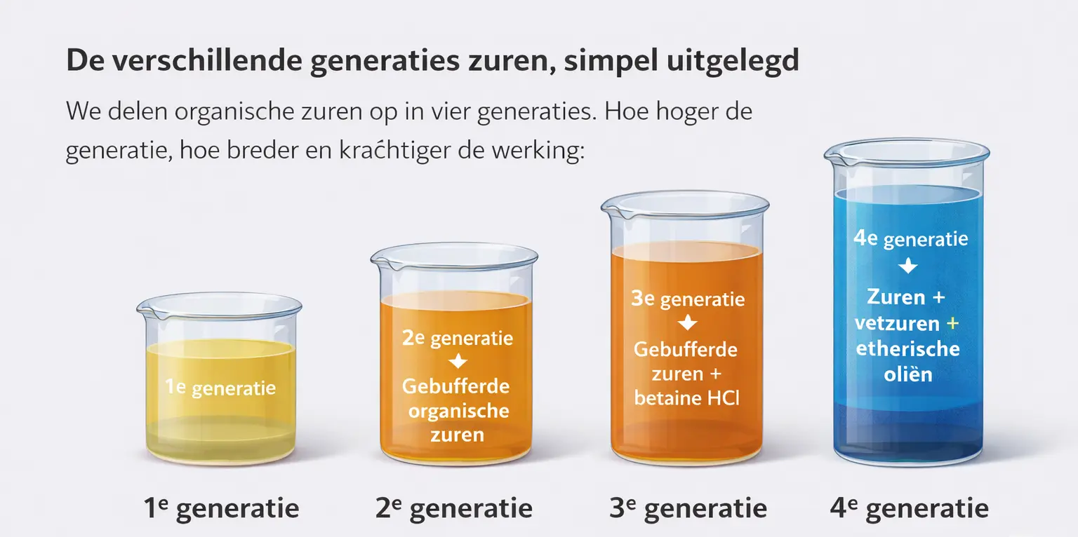 We delen organische zuren op in vier generaties. Hoe hoger de generatie, hoe breder en krachtiger de werking: