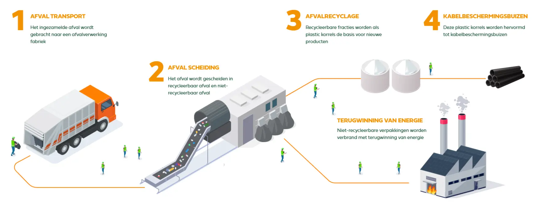 Omdat je actief bijdraagt aan een circulaire keten. De ingezamelde verpakkingen worden eerst correct getransporteerd en gescheiden, waarna recycleerbare materialen worden omgezet in nieuwe grondstoffen voor toepassingen zoals kabelbeschermingsbuizen. Niet-recycleerbaar afval wordt bovendien nuttig ingezet via energieterugwinning. Zo zorg je niet alleen voor een proper bedrijf, maar ook voor een duurzamere landbouwsector.