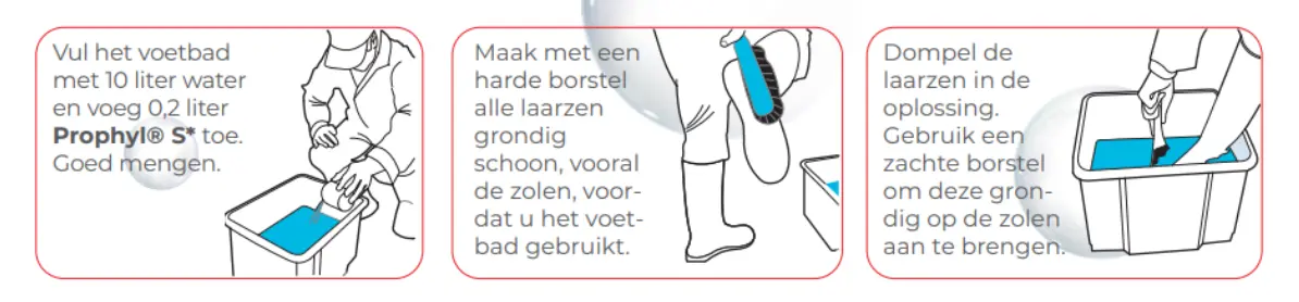 - Toegangssluizen/ingangen: vul laarzenbaden en desinfectiematten met een Prophyl S-oplossing. Laarzen of schoenen vooraf reinigen, dan dompelen.