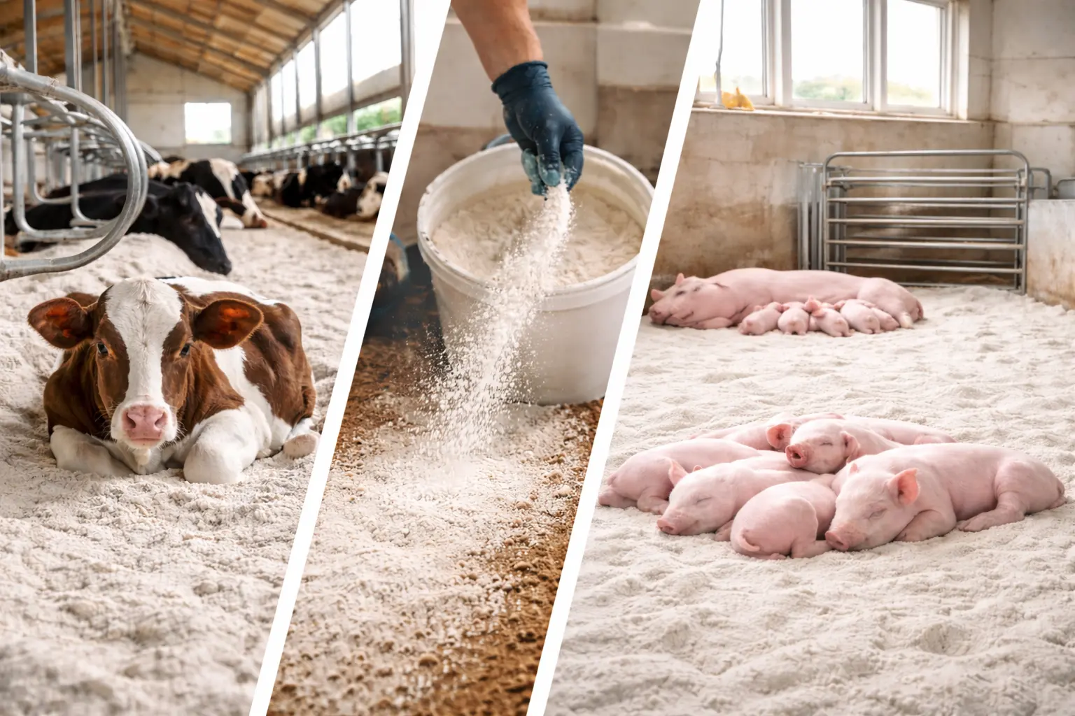 Toepassing: In het biggennest, op de uier én in de voederbak van de zeug – vooral rond werpen en spenen. Steeds in combinatie met een drogend ligbedproduct.